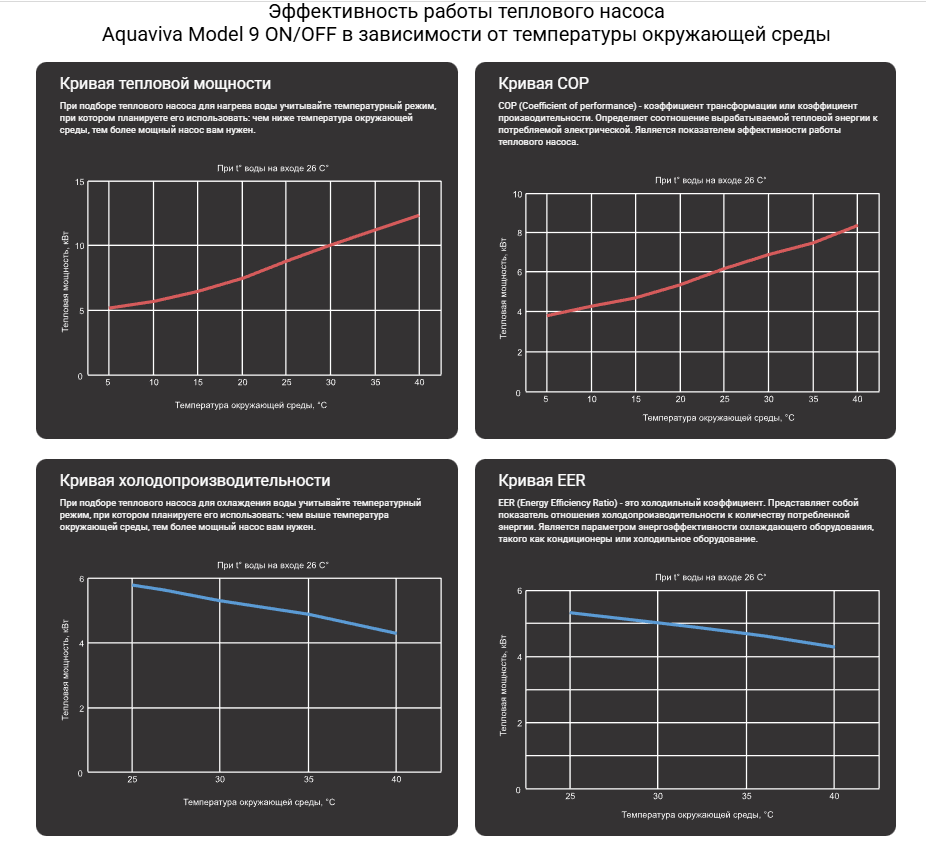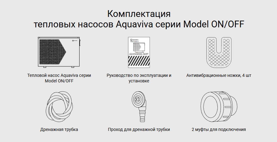С насосом Aquaviva серии Model ON/OFF вы можете наслаждаться комфортной температурой воды в бассейне на протяжении всего сезона купания. Компрессор Mitsubishi обеспечивает стабильную работу насоса при температуре окружающей среды от -5 до 40°С. Вы можете нагревать воду в пределах от 15 до 40°С или охлаждать - в диапазоне от 8 до 35°С .